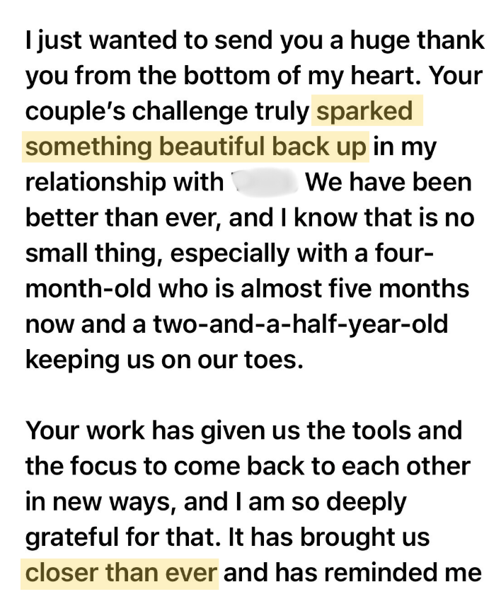 In the hustle and bustle of daily life, it's all too easy to find yourself giving the scraps of your energy and time to your partner. You can end up in a state of function and routine... rather than one of closeness, excitement, & intimacy.